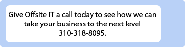 With Offsite IT you have the benefits of a fully staffed IT department, at a tiny fraction of the cost - and for much less than it's costing you to function without qualified IT support. We are at your service 24 hours a day, 365 days a year. When you do have a problem, there's just one number to call, any time of day or night. |